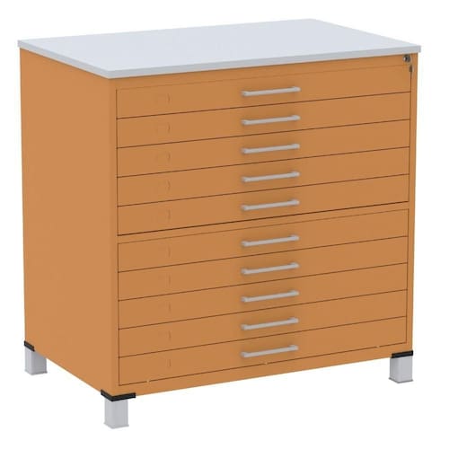 Mapoteca 10 Gavetas Pandin 120 cm (Larg) Inmetro Tampo MDP Cinza Estrutura e Gavetas em Aço Laranja
