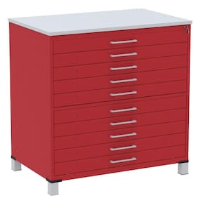 Mapoteca 10 Gavetas Pandin 120 cm (Larg) Inmetro Tampo MDP Cinza Estrutura e Gavetas em Aço Vermelho