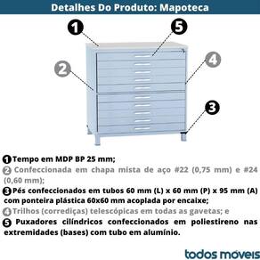 Fabricada com chapa de aço resistente, a mapoteca de aço galvanizado foi desenvolvida com um processo de tratamento anticorrosivo de nanotecnologia e pintada com tinta híbrida eletrostática para maior durabilidade. Com chapas mistas de aço #22 (0,75mm), #24 (0,60mm) e tampo em MDP de 25mm, garante robustez e eficiência perfeitas para espaços de trabalho que necessitam de armazenamento especializado.
