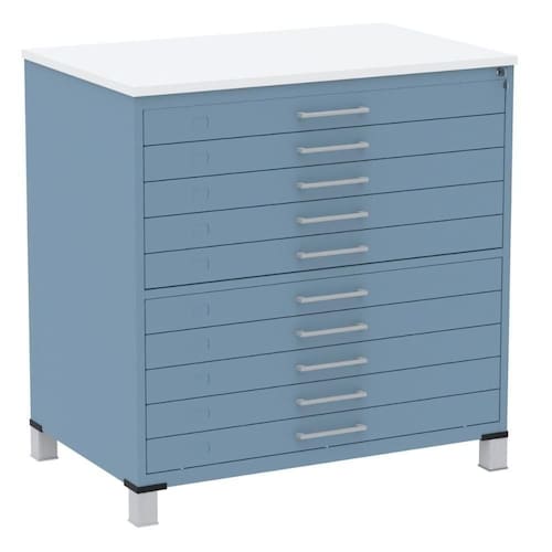 Mapoteca 10 Gavetas Pandin 120cm (larg) Inmetro Tampo Mdp Branco Estrutura E Gaveta Em Aço Azul Dali