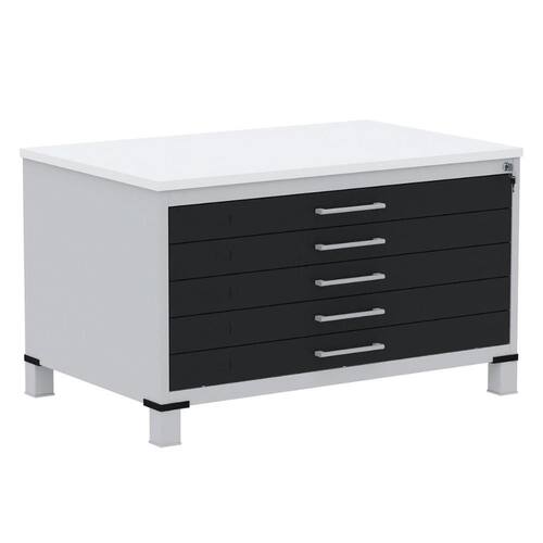 Mapoteca 5 Gavetas Pandin 120 cm (Larg) Inmetro Tampo MDP Branco Estrutura Aço Cinza Gavetas Pretas