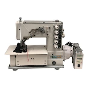 Essa máquina é completa e acompanha mesa fórmica, pé de ferro e motor direct drive acoplado ao cabeçote, assim como todas as outras máquinas convencionais. Ela possui 3 agulhas e 5 fios, permitindo uma costura de alta qualidade. A largura da costura é de 6,35mm - 1/4 e a altura do calcador é de 6mm.
