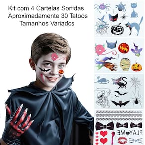 As cartelas são um complemento para sua maquiagem, proporcionando aquele charme das festas de terror e Halloween. Os modelos são todos temáticos. O kit é composto por 4 cartelas, proporcionando assim maior diversidade na sua maquiagem. Devido ao alto giro, não é possível a escolha de modelos, enviaremos conforme disponibilidade de estoque. Os modelos podem não ser como o das fotos, mas todos são temáticos. Possui aproximadamente 30 modelos diferentes de tattoo.