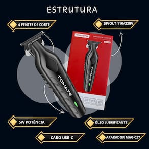 O modelo MAG-027 possui potência de 5 W e vem equipado com uma bateria recarregável, garantindo funcionamento contínuo e eficiente. Acompanha cabo USB para carregamento, escova para limpeza, quatro pentes com diferentes medidas e óleo lubrificante — tudo o que você precisa para um corte preciso e de qualidade.