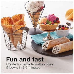 Cozinhe cones crocantes e amanteigados rapidamente em 2 3 minutos\r\nInclui placa de waffle e acessórios de rolo de cone\r\nControle de escurecimento, luzes de ligar e pré aquecer\r\nPlacas antiaderentes fáceis de limpar\r\nzenamento vertical com economia de espaço e zenamento de cabos na tampa inferiorTipo