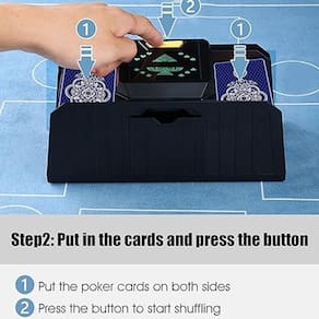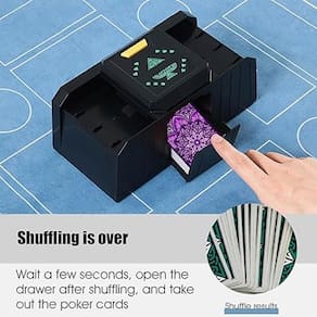 Material: ABS Cor: preto Tamanho do pacote: 25 × 13 × 13 cm Peso da embalagem: 0,65 kg Lista de embalagem: 1 x embaralhador automático de cartas O embaralhador automático de cartas suporta um ou dois baralhos ao mesmo tempo, proporcionando embaralhamento rápido e uniforme em segundos, liberando suas mãos para uma jogabilidade mais suave e agradável. Projetado para reduzir a curvatura das cartas e o desgaste da superfície, o mecanismo interno suave preserva a qualidade das cartas e prolonga a vida útil das cartas durante sessões frequentes de pôquer e jogos de tabuleiro. Compatível com a maioria das cartas de baralho padrão, incluindo cartas de pôquer e guandense, com tamanhos de manuseio de até 9,7 x 6,5 cm para uso versátil em vários tipos de jogos. A caixa durável em ABS fornece uma estrutura robusta e estável com baixo ruído operacional, tornando-a adequada para noites de jogos em casa, festas e ambientes de mesa competitivos. Alimentada por baterias ou fonte de alimentação externa, esta máquina de embaralhar é fácil de operar, portátil e ideal para Texas Hold'em, jogos de tabuleiro e entretenimento familiar.