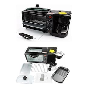 Máquina de café da manhã 3 em 1 com forno, frigideira e cafeteira. Design compacto e eficiente, ideal para pequenos espaços. Cafeteira integrada. Frigideira removível. Forno para torradas. Fácil de usar e limpar.Forno autolimpante