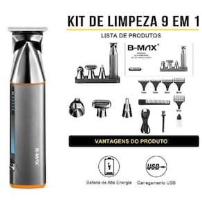 Máquina 9x1 Acabamento Corte Cabelo Barba Aparador de Pelos Nariz Elétrico Recarregável Produto com alta qualidade premium, motor com alta potência de 5w e durabilidade, além de uma lâmina eficaz e afiada. 4 lâminas magnéticas que facilita a troca e uso para atender qualquer necessidade. - Aparador de cabelo: Para um acabamento ultrafino de 0.2mm. Use com guias de pente para comprimentos de corte de 1/2/3/6/9mm. - Aparador de detalhes: Define linhas e bordas retas ou curvas. - Aparador barbeador de folha: Para finalizar bordas e linha do cabelo com um barbeador rente. - Aparador de nariz e orelha: Lâmina para corte rente seguro e suave. Informações adicionais: - Bateria recarregável integrada - Uso sem fio e com fio - Cabeças de encaixe e trava de troca rápida - Lâminas de corte de aço inoxidável - Acessórios laváveis e fáceis de limpar - Luz indicadora de funcionamento e carregamento - Entrada: 5V --- 1A Potência: 5W - 1.5 horas de carregamento e 100 minutos de uso. Itens inclusos: 1. Lâmina para cabelo 2. Lâmina para detalhes 3. Lâmina para barba 4. Lâmina para nariz e orelha 5. Pente 1mm 6. Pente 2mm 7. Pente 3mm 8. Pente 6mm 9. Pente 9mm + Escova, vassoura, óleo lubrificante e carregador.