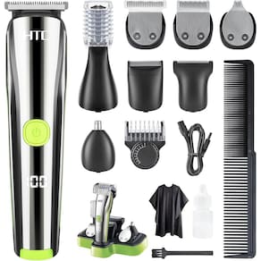 Inclui 4 pentes guias: 3, 6, 9 e 12 mm - 5 aparadores: cabelo, barba, bigode, para nariz e orelhas e de precisão - Cabo de alimentação - Base carregadora - Escova de limpeza - Óleo lubrificante - Pente de barbeiro - Protetor da lâmina - Manual