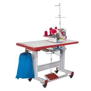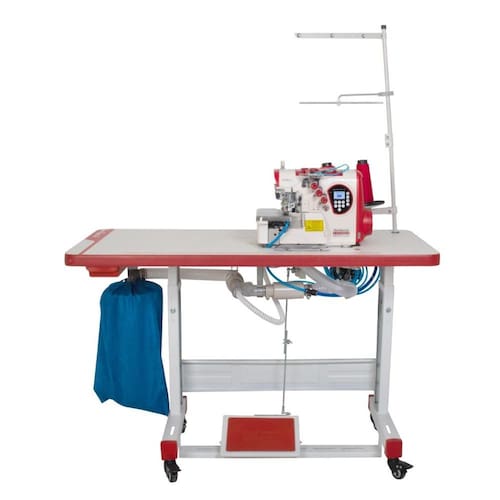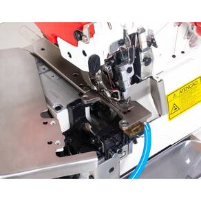 Máquina de costura overlock com embutidor de correntinha automática eletrônica para confeção de vestuário com tecidos leves e médios.
