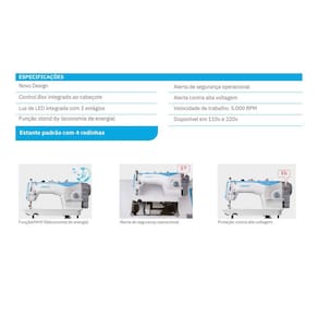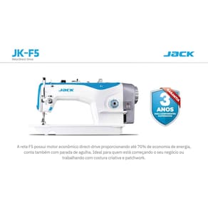 Descrição do produto: Informações adicionais do produtoModerno Design Control Box integrado ao cabeçote Luz de LED integrada com 3 estágios Função stand-by (economia de energia) Velocidade de trabalho: 5.000 RPM Disponível em 110v e 220v Alerta de segurança operacional Alerta contra alta voltagem Máquina Reta industrial 1 agulha com motor eletrônico direct drive da JACK, equipada com função automática de posicionamento de agulha, caixa de controle e painel com display digital acoplados ao corpo da máquina. A Máquina de Costura Reta Industrial Jack F4 oferece um motor extremamente silencioso e econômico e realiza todo tipo de costura reta normal como pregar zíper, viés, fazer barras, bainhas, aplicar elástico e etc.Máquina Reta industrial 1 agulha com motor eletrônico direct drive, equipada com função automática de posicionamento de agulha, caixa de controle e painel com display digital acoplados ao corpo da máquina.- Voltagem: 220v ou 110V- Modelo: JK-F5- Peso: 75 kg Diferenciais e características: Design exclusivo JackCaixa de controle e painel acoplados ao cabeçote da máquina, simplificando a montagemMotor Direct-Drive ligado diretamente ao eixo principal, proporcionando mais agilidade, economia e menos ruídosEixo superior e estica fio rolamentadosCaixa de controle e painel acoplados ao cabeçote da máquina, simplificando a montagemMotor Direct-Drive ligado diretamente ao eixo principal, proporcionando mais agilidade, economia e menos ruídosBarra de agulha com micro-lubrificação que reduz o risco de manchas de óleo no tecido,Utilização: IndustrialAplicação: Tecidos leves e médioSistema de Transporte: SimplesNº de agulhas: 1Tipo de agulha: DBx1Nº de fios: 2Tamanho do ponto: de 0 a 5mmLançadeira: PequenaSistema de lubrificação: AutomáticaTipo/potência do motor: Direct drive 550W (Zero ruído)Marca: JackModelo: F5Completa com mesa, porta fio e motor Direct DriveAcompanha estante e tampo personalizados com a marca Jack.GARANTIA: 3 ANO*Montagem por conta do comprador*