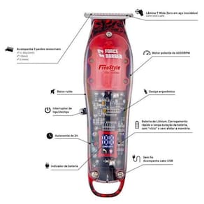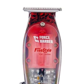 A Máquina de Acabamento Profissional Freestyle Red Edition é a sua chance de ter os cortes rentes e linhas perfeitas das ferramentas Force Barber na sua barbearia. Finalize seus cortes com a máxima eficiência com sua lâmina T-Wide, que facilita a realização de trabalhos artísticos como hair tattoo e freestyle. Sua cor vermelha e estampa de tatuagem apresentam um design cheio de atitude e estilo. A Freestyle Red Edition é uma máquina de acabamento levíssima e com tecnologia inovadora, oferecendo 2 horas de funcionamento ininterruptas e visor indicando o percentual restante da carga da bateria. Entregue acabamentos rentes e com detalhes impressionantes.