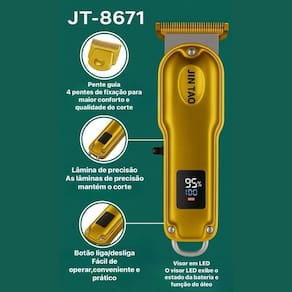 Máquina de Acabamento Visor LCD Recarregável Máquina de Acabamento Visor LCD Recarregável ===================================== A Máquina de Acabamento foi desenvolvida para oferecer cortes precisos, rápidos e confortáveis, ideal para ou doméstico. Seu design moderno com corpo em metal resistente e acabamento premium está disponível nas cores dourado e prata, garantindo durabilidade e estilo. Com lâmina de precisão de alta performance, proporciona cortes limpos e detalhados, perfeita para acabamento de barba, cabelo e desenho. O visor LED inteligente exibe o nível de bateria e alerta para a lubrificação das lâminas, garantindo o melhor desempenho do equipamento. ===================================== Contém: 01 Máquina de Cortar Cabelo 01 Cabo USB 04 Pentes 01 Escova de Limpeza Especificações: - Material: Corpo em metal resistente - Lâmina: Lâmina de precisão em aço de alto desempenho - Visor LCD: Indica nível de bateria e alerta de óleo - Recarregável: USB - Design: Ergonômico para melhor manuseio e conforto - Potência: Motor silencioso e eficiente - Cor: Dourado ou Prateado enviado de forma aleatória Benefícios: - Corte preciso e uniforme graças à lâmina de alta qualidade - Maior durabilidade devido à construção metálica robusta - Conforto no uso com design ergonômico e leve - Facilidade no acompanhamento da carga com visor LED - Ideal para profissionais e uso doméstico - Versatilidade: indicado para cortes, acabamentos, contornos e desenhos ===================================== Devido à diferença entre monitores e iluminação diferentes, pode haver variação na tonalidade apresentada no anúncio. Medidas muito aproximadas. Marca: Não Informado Ean: 6013400075602
