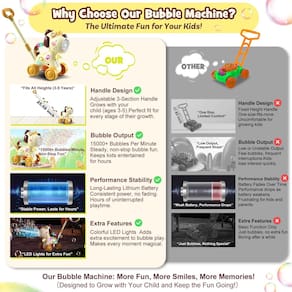 Torne a brincadeira mágica com estes adoráveis brinquedos de bolhas para cães, perfeitos para crianças de 3 a 5 anos. Com dois modos divertidos — empurre com a alça ou use-o como um soprador portátil — é ideal para brincadeiras internas e aventuras ao ar livre no parque, praia ou quintal. Este brinquedo versátil estimula brincadeiras ativas, mantendo as crianças entretidas com milhares de bolhas por minuto. Alimentado por uma bateria recarregável, proporciona diversão duradoura e luzes brilhantes que piscam adicionam emoção extra, o que o torna ótimo para festas de aniversário, Halloween, casamentos ou reuniões de família. Seja de dia ou de noite, cria uma atmosfera vibrante e alegre. Feita de plástico ABS não tóxico e durável, esta máquina de bolhas é segura, à prova de vazamentos e perfeita para uso ao ar livre, desde jogos no quintal até viagens na praia e atividades pré-escolares. Presente perfeito para aniversários, Natal ou qualquer feriado. Ideal para filhos de amigos, sobrinhas, sobrinhos ou netos visitantes, é um brinquedo divertido e envolvente para meninos e meninas, oferecendo entretenimento cheio de bolhas sem fim. - Dois modos de brincar e forma de cachorro fofo: esta máquina de bolhas de cachorro brincalhão oferece dois modos de diversão: ? Pressione a alça para desfrutar de um fluxo constante de bolhas enquanto as crianças caminham, ? Ou mude para o modo portátil para aventuras cheias de bolhas em qualquer lugar. Brinquedos infantis ideais de 3 a 4, são perfeitos para brincadeiras internas e aventuras ao ar livre no parque, jardim ou praia. - Saída de bolha maciça e bateria recarregável: Com 10 bicos de bolhas e uma bateria recarregável, esta máquina de bolhas produz um fluxo constante de bolhas — milhares por minuto! Ótimos brinquedos infantis para diversão ao ar livre, encontros, acampamentos ou simplesmente para manter as crianças entretidas em reuniões de família. Brinquedos ao ar livre para crianças. - Acende para brincadeiras emocionantes: com luzes vibrantes piscando, este fabricante de bolhas com tema de cachorro adiciona um toque mágico a qualquer ocasião. Seja uma festa de aniversário, evento familiar ou festival como o Halloween, seu show colorido de bolhas com efeitos de luz encanta crianças e crianças. - Estrutura resistente e segura para crianças: Feito de plástico ABS não tóxico de alta qualidade, este marcador de bolhas é construído para durabilidade e segurança. O design à prova de vazamento e dois frascos de 90 ml de solução de bolhas o tornam uma excelente escolha para crianças ativas. Perfeito para dias de praia, brincadeiras no quintal ou diversão na pré-escola. - Presente ideal para crianças: torne qualquer celebração especial com esta máquina de bolhas em forma de cachorro. Um presente fantástico para meninos e meninas de 3, 4, 5 e 6 anos, é perfeito para aniversários, Natal e feriados. Surpreenda os filhos, sobrinhos, sobrinhos ou netos de amigos com um brinquedo divertido e envolvente que iluminará qualquer evento ou ocasião especial.