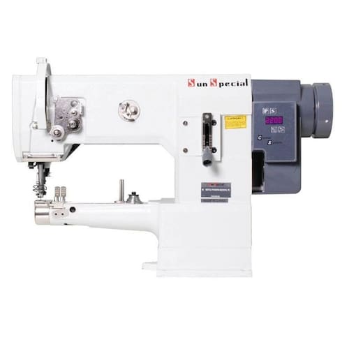 A máquina de costura de braço está equipada com lançadeira grande e chapa móvel para aplicação de viés ou debrum em bolsas, mochilas e carteiras de couro. Indicada também para o trabalho em materiais acolchoados utilizados na fabricação de colchões e outros materiais sintéticos pesados.
