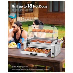 Asse como um profissional! A nossa máquina de cachorro-quente possui um grill em aço inoxidável de qualidade comercial. É a escolha ideal para barracas de comida, festas familiares e churrascos. Projetada para diferentes tipos de cachorros-quentes, salsichas, almôndegas, etc. Controle preciso de temperatura, podendo ajustar a temperatura de cozimento até 250°C separadamente para os rolos da frente e de trás. Construída com uma estrutura durável em aço inoxidável, esta máquina proporciona não apenas um visual moderno, mas também um desempenho duradouro. A tampa de vidro bloqueia sujeira e mantém os alimentos aquecidos, reduzindo o tempo de cozimento. A bandeja removível mantém sua cozinha limpa e facilita a limpeza. Os rolos podem girar 360° para cozinhar os alimentos de forma uniforme, enquanto o motor potente oferece um cozimento altamente eficiente. Detalhes íntimos incluem um aquecedor de pães para até 18 unidades, e a caixa de armazenamento oferece espaço conveniente para pincéis, clipes, espetos ou luvas, ajudando a economizar espaço no balcão e manter sua cozinha organizada.