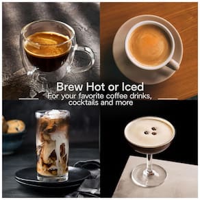 Potência de 1450 watts, voltagem 120 V, design compacto e moderno em plástico resistente. Inclui acessórios como jarra para leite quente, escova de limpeza, colher medidora, filtro reutilizável e teste de dureza da água.