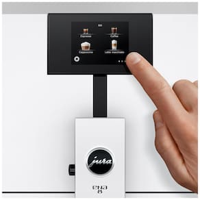 Máquina de café expresso automática Jura ENA8 com moedor de grãos, intensidade, volume e temperatura programáveis, função de duas xícaras, display touchscreen e design moderno.Moedor de café integrado