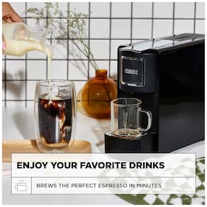 ELEGANTE E COMPACTA Graças ao seu tamanho compacto, esta elegante e elegante máquina de café expresso com cápsulas é fácil de zenar e não ocupa muito espaço, deixando sua bancada livre de desordem. Seu design moderno e sofisticado complementará qualquer decoração de cozinha