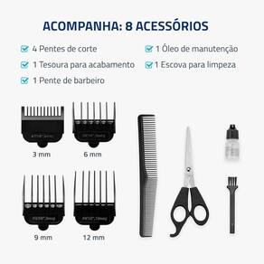 Praticidade completa: Acompanha tesoura, pente, óleo de manutenção, protetor de lâmina e escova para limpeza.