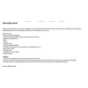Descrição Geral Máquina de Corte de Faca em aço, de 6 polegadas, com 750w capacidade de corte de 160mm e afiador de facas. Indicado para cortar grandes quantidades de tecidos como: Algodão, Lã, Sedas, Jeans, Sintéticos, Lonas e outros.