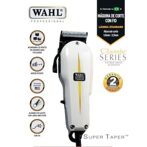 Máquina de corte profissional com fio Super Taper Wahl. Esta é a máquina mais famosa da Wahl, presente há mais de 50 anos no mercado. Atende aos profissionais cabeleireiros e barbeiros.