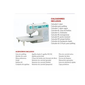 Suplemento de carretel: Pino de carretel extra Manual: Espanhol Capa de proteção Compartimento de acessórios: Bolsa de acessórios Calçadores Acessórios Inclusos: Calçador de zigue-zague J, Calçador de casear A, Calçador de pregar zíper I, Calçador de pregar botão M, Calçador para ponto cego R, Calçador de chuleado G; Calçador de monograma N; Calçador de transporte duplo Outros Acessórios Inclusos: Conjunto de agulhas 3 pç=75/11x1, 90/14x1, 100/16x1 ; Agulha de ponta esférica 90/14x1 ; agulha dupla; escova de impeza; abridor de costura; vazador de ilhós Pedal Máquina