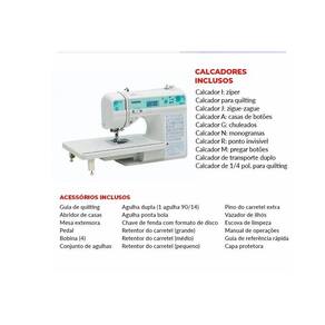 Suplemento de carretel: Pino de carretel extra Manual: Espanhol Capa de proteção Compartimento de acessórios: Bolsa de acessórios Calçadores Acessórios Inclusos: Calçador de zigue-zague J, Calçador de casear A, Calçador de pregar zíper I, Calçador de pregar botão M, Calçador para ponto cego R, Calçador de chuleado G; Calçador de monograma N; Calçador de transporte duplo Outros Acessórios Inclusos: Conjunto de agulhas 3 pç=75/11x1, 90/14x1, 100/16x1 ; Agulha de ponta esférica 90/14x1 ; agulha dupla; escova de impeza; abridor de costura; vazador de ilhós Pedal Máquina