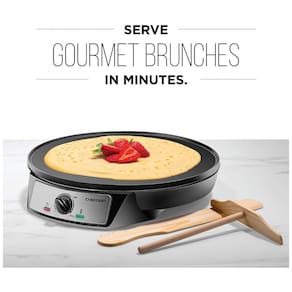 CADA DESEJO DE CAFÉ DA MANHÃ Faça todas as manhãs um deleite com seu Chefman Electric Griddle Crepe Maker. Sirva deliciosos crepes, blintzes, panquecas, ovos e bacon de forma rápida e fácil. A superfície antiaderente de 12 polegadas é ideal para alimentar toda a família. Esta panela de crepe multifuncional funciona como uma chapa, perfeita para café da manhã, brunch, almoço ou até mesmo jantar.
