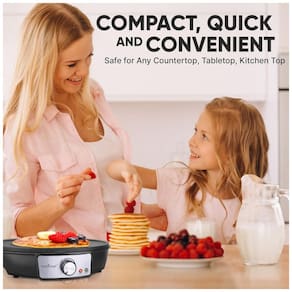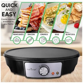 Máquina de crepe elétrica antiaderente Nutrichef PCRM12, ideal para preparar crepes, panquecas, bacon e ovos. Design compacto, temperatura ajustável e luz indicadora. Inclui espátula de madeira e espalhador de massa.Porta-fio