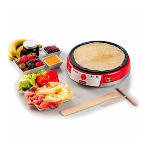 Máquina de Crepe retrô com design exclusivo dos anos 50. Placa elétrica antiaderente com 28 cm de diâmetro. Inclui duas espátulas de madeira e um enrolador de massa.Porta-fio