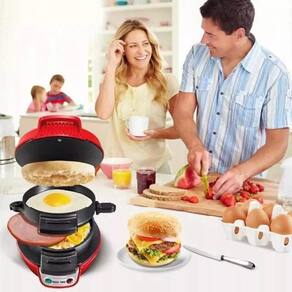 Máquina versátil para hambúrgueres, sanduíches de café da manhã com ovos e waffles. Design inovador que economiza tempo e mantém a cozinha limpa. Materiais antiaderentes premium para fácil limpeza. Permite o uso de ingredientes frescos para criar pratos personalizados. Ideal para pessoas com rotina corrida, estudantes e amantes da gastronomia. Aquecimento dupla face. Placa de aquecimento suspensa.Funciona como grill