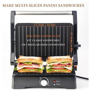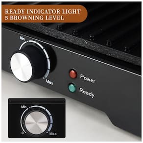 Máquina 3 em 1: pode ser usada como sanduicheira, grill de contato e aberta 180 graus para grelhar. Possui 5 níveis de tostagem, bandeja para recolher excesso de óleo, alça antitérmica e bandeja antiaderente. Luzes indicadoras de ligado, pronto e feito.Funciona como grill