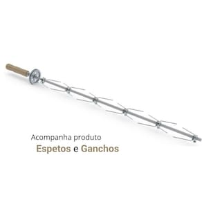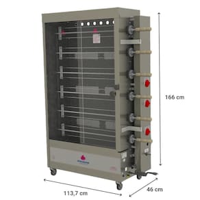 Características Técnicas: A gás baixa pressão Energia elétrica (bivolt): Serve para acionar componentes elétricos como o motor do espeto giratório ** Aquecimento a gás através de queimadores infravermelhos e tubulares Acompanha espertos e ganchos Estrutura em aço inox escovado Fundo interno esmaltado Visores frontais em vidro temperado Costa interna esmaltada 6 queimadores infravermelhos alimentado a gás Porta em vidro temperado Rodízios para facilitar o deslocamento Com gaveta coletora de gordura que facilita o manuseio e a limpeza Queimadores infravermelhos e espetos tipo garfo Controle progressivo de chama máxima e mínima Medidas internas: 131,5 x 85 x 34,5 cm (AxLxP) Consumo médio 0,18 kg/h (por queimador)