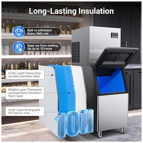 Ficha Técnica Especificação Detalhes Marca QAUSOU Modelo Commercial Ice Maker Material Aço inoxidável Capacidade de produção 272 kg de gelo por dia Bin de armazenamento 181 kg Produção por ciclo 156 cubos em 5-15 minutos Ajustes de gelo 30 espessuras ajustáveis Voltagem 110 V Refrigerante R290a Dimensões (P x L x A) 84 cm x 56,5 cm x 147,5 cm Altura 147,5 cm Compressor Cobre puro com recirculação Isolamento Tripla camada (10 horas retenção) Filtro PP cotton 18 mm (0,5 µm) Painel LCD com 5 botões (temporizador, autolimpeza) Funções Autolimpeza, temporizador, descongelamento Componentes inclusos Máquina de gelo comercial Cor Prata Peso 150 kg Marca: Não Informado