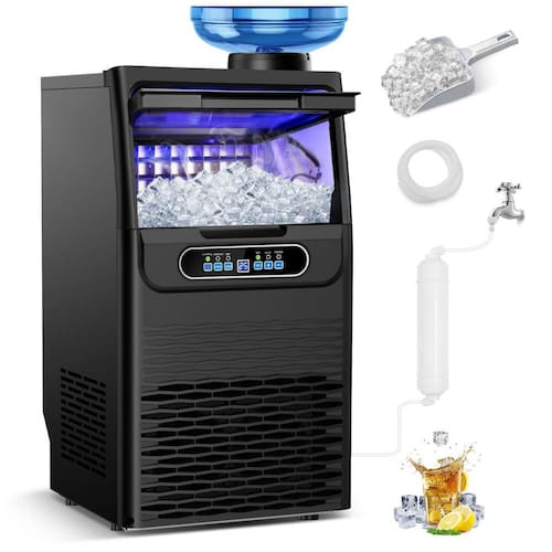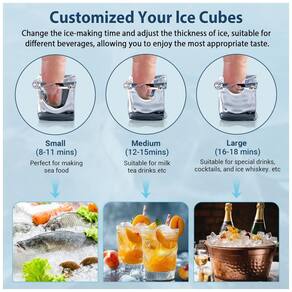A Máquina de Gelo Comercial RAPSUAR utiliza um compressor de 350W de alta eficiência para produzir 36 cubos de gelo claros e sólidos a cada 9-15 minutos, alcançando até 45 kg de gelo por dia. Equipada com opções duplas de entrada de água, suporta conexão direta à torneira ou garrafões, incluindo filtro de água integrado que remove impurezas para garantir gelo cristalino em cada ciclo. O painel de controle LCD intuitivo permite ajustes precisos de tempo de produção e espessura dos cubos via botões (+) e (-), com funções automatizadas de limpeza, descongelamento, agendamento e alertas de falhas para operação simplificada.