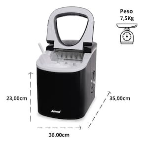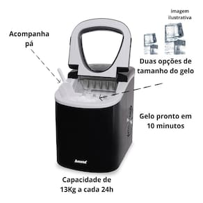 Máquina de gelo portátil com capacidade de produção de 13 kg de gelo em 24 horas. Produz cubos de gelo em duas opções de tamanho, em até 10 minutos. Possui sensor de falta de água e sensor de reservatório cheio. Acompanha cesto para transporte e pá para gelo.Capacidade de armazenamento de gelo