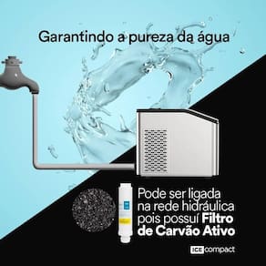 Ficha Técnica :: Alta capacidade: 35kg/dia. :: Resistente: Corpo em inox para dar mais robustez e facilidade de limpeza. :: Alta capacidade de armazenamento: Até 4kg. :: Adaptável: Pode ser alimentada com água de forma automática, sendo ligada a rede hidráulica ou manualmente, através de sua tampa superior. :: Mais Saúde: Com filtro de carvão ativo para garantir sempre um gelo mais puro. :: ECO-FRIENDLY: Refrigeração por compressor super silencioso com gás ecológico que não agride o meio ambiente. :: TURBO ICE: produz 36 cubos de gelo a cada 15 minutos. :: Compacto e portátil, cabe em vários cantinhos, vai aonde você quiser e ainda combina com qualquer ambiente. :: Potência: 200W :: Gás Refrigerante: R290 (42g) :: Tanque de água: 3,8L