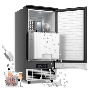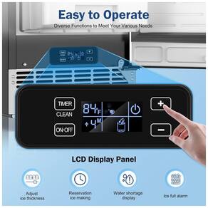 A porta com alça em aço inoxidável é reversível, permitindo instalação com dobradiças esquerda ou direita para adaptação a diferentes layouts. O painel de controle digital suporta timer de 24 horas para programação de ligar/desligar, ajuste de espessura dos cubos via tempo de congelamento e ativação de autolimpeza pelo botão "Timer Clean" mantido por 5 segundos, iniciando ciclos automáticos de higienização. O abastecimento automático de água ocorre via tubo de entrada traseiro, assegurando fluxo contínuo sem recargas manuais. Equipada com compressor de 750W e refrigerante R290a, oferece resfriamento eficiente, mantendo a forma dos cubos no bin por períodos prolongados.
