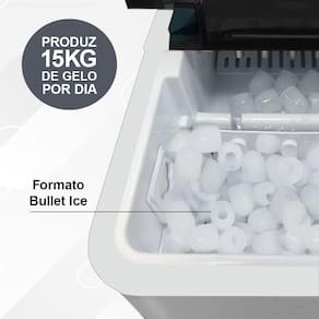Design moderno com tampa transparente e acabamento em prata; Controle simples com painel intuitivo; Produção rápida de gelo em minutos com modo Turbo; Cesto removível e função auto limpeza para higienização prática; Produção de gelo puro e seguro com água potável; Funcionamento silencioso, ideal para qualquer ambiente; Sensor que indica reservatório cheio; Sustentável com gás ecológico R600a.