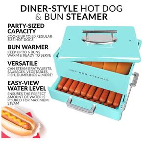 GRANDE ESTILO E EXCELENTE SABOR O sistema de vaporização de cachorro quente estilo lanchonete cozinha até 20 cachorros quentes por vez e pode cozinhar salsichas de café da manhã, bratwursts, vegetais, peixes, bolinhos e muito mais BANDEJA DE AQUECIMENTO DE PÃO O aquecedor de pão comporta até 6 pães por vez, mantendo os aquecidos e prontos para serem saboreados FÁCIL DE USAR O botão de cozimento de 3 posições Alto, Quente e Desligado torna o cozimento sem esforço basta adicionar água, colocar a tampa e girar para Alto e os cachorros quentes cozidos no vapor estarão prontos em 15 a 20 minutos JANELA DE NÍVEL DE ÁGUA A janela de nível de água de fácil visualização garante que a quantidade certa de água seja despejada. Sinta se à vontade para cozinhar carnes com cerveja e outras bebidas para adicionar um sabor incrível FÁCIL DE LIMPAR A unidade é fácil de desmontar, facilitando a limpeza Marca: Não Informado