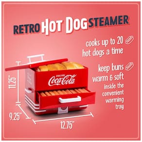 Máquina de Hot Dog Nostalgia Coca Cola para até 24 salsichas, com sistema de vaporização e aquecedor de pão para 6 pães. Possui botão de cozimento com 3 posições, janela de nível de água e zenamento de cabo oculto.