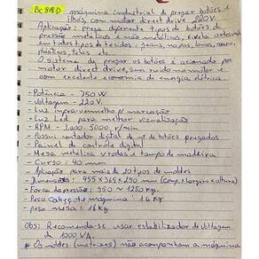 Máquina de botão de pressão BRACOB BC 818 com motor direct drive no cabeçote, painel de controle digital, contador de operação, luz de posição infravermelha (laser), luminária LED e mesa com rodinhas. Possui pedal conectado a um acionador que regula a velocidade do motor, funcionando de forma silenciosa e com economia de energia. Requer lubrificação manual antes do uso.Funções