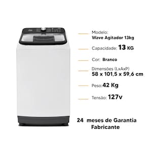 Especificações Técnicas: -Marca: MIDEA -Modelo: Wave Agitador 13kg -EAN: 7898761370066 -Cor: Branco -Tipo de Máquina de Lavar: Automático -Tipo de Carga: Superior -Capacidade total: 13 Kg -Inverter: Não -Produto Conectado: Não -Wifi: Não -Inteligência Artificial: Não -Tipo: Top Load -Material Interno (Cesto): Aço Inox -Material Externo: Plástico/Aço -Cor da Cabine: Branco -Cor da porta: Cinza Escuro -Cor Interna: Prata -Programas (Quantidade): 13 -Ciclos Disponíveis: Molho | Lavar | Enxaguar | Centrifugar -Acompanhamento dos Estágios de Ciclo: Não -Programas: Brancas | Coloridas | Rápido 20’ | Algodão | Sintético | Super ECO | Tênis | Delicado/lã | Cama e banho | Edredom | Jeans | Tira-manchas | Limpeza do tambor-Ciclos Disponíveis: Molho / Lavar / Enxaguar / Centrifuga -Função (Quantidade): 10 -Funções: Avançar etapa | Nível de sujeira | TURBO | Nível de água | Perfume+ | Reuso de água | Enxágue+ | Centrifugação+ | Silenciar | Travar Painel de Controle -Tecla Nível de Sujeira: Extra alto | Alto | Médio | Baixo -Tecla Iniciar Pausar: Não -Painel: Mecânico (Botão Seletor) -Display: LED -Tipo de Trava: Eletrônico -Pés Ajustáveis: Sim -Timer: Sim -Luz do Cesto: Não -Filtro: Nao -Dispenser: Sim -Tipo de Água: Fria -Consumo de Energia (Agua Fria): 0,38 kWh/ciclo -Consumo de Água: 114 L/ciclo -Função Trava Painel: Sim -Função Avançar Etapa: Sim -Função Turbo: Sim -Função Reúso Água: Sim, 94 Litros na capacidade máxima -Tipo de tomada: 10ª -Dimensão do produto (L × A × P) 58 x 101,5 x 59,6 cm -Tensão: 127v -Peso: 42 Kg -Peso Bruto: 46 kg