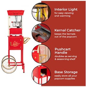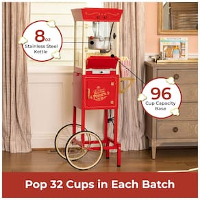 CAPACIDADE DE PIPOCA seja na hora do filme ou na hora do lanche, este suporte vintage para máquina de pipoca produz até 950g de pipoca de cinema por lote para manter os baldes de todos cheios. KITS E SUPRIMENTOS Todos os kits de pipoca Nostalgia funcionam com esta máquina de pipoca. Experimente o kit de chaleira e ar quente para teatro, óleo de pipoca, pacotes de temperos, tigelas de pipoca reutilizáveis e o kit de pipoca de óleo de coco pré medido. CHALEIRA GRANDE A chaleira de aço inoxidável contém 230g de grãos de pipoca e é projetada com um sistema de agitação de grãos embutido. Possui uma tampa com dobradiças duplas para esvaziar facilmente a pipoca e a chaleira pode ser removida para facilitar a limpeza. VIDRO DE SEGURANÇA TEMPERADO Nossa máquina de pipoca tem janelas que resistem a quebra, arranhões e calor para manter você e sua família s. Então pegue seus pacotes de pipoca e vá embora. NOSTALGIA Desde designs inspirados na América do início do século 20 até o apelo atemporal de nossos eletrodomésticos, oferecemos produtos exclusivos, inovadores e divertidos para a família. Nós preservamos o passado, abraçamos o presente e olhamos para o futuro