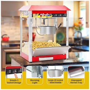 Máquina de pipoca comercial com 1300W de potência e chaleira de 0,35 gramas, que aquece rapidamente e é capaz de estourar até 60 xícaras de pipoca por lote em torno de 13,54 gramas para atender a demanda de sua loja movimentada. Possui deck aquecido para manter a pipoca fresca e uma gaveta para coletar os grãos rejeitados e facilitar a limpeza. A estrutura é durável, feita de aço laminado a frio e painéis de acrílico resistentes. As portas possuem travas magnéticas para evitar a entrada de poeira e insetos voadores. O design simples permite o controle com três interruptores Aquecedor, Agitador e Aquecedor de panela. A plataforma de aquecimento possui um tubo de aquecimento de 60 W embaixo, mantendo a temperatura e a crocância da pipoca, além de uma luz mais quente de 60 W que ilumina intensamente a pipoca. É fácil de usar, basta colocar os grãos de pipoca e o óleo na máquina, conectá la e pressionar o botão Iniciar para estourar pipoca quente e fresca de forma rápida e eficiente. A máquina de pipoca de mesa é compacta e pode ser facilmente colocada em qualquer bancada. Acompanha colher de pipoca e copo medidor. A proporção recomendada de milho para óleo e açúcar é 211. Fácil montagem e equipe profissional de atendimento ao cliente pronta para ajudar em caso de problemas.