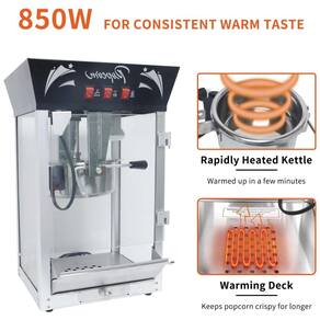 Máquina de pipoca comercial Jaxenor, estilo cinema, com capacidade de 340g, potência de 850W, fabricada em aço inoxidável, com vidro temperado, sistema de agitação integrado, plataforma aquecedora, bandeja de grãos não estourados e design de 3 interruptores.Luz indicadora de funcionamento