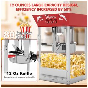 Máquina de Pipoca Comercial de 340 g: Esta máquina de pipoca comercial possui 900W de potência de aquecimento e uma panela de aço inoxidável de 340 g, produzindo aproximadamente 15,1 litros de pipoca por lote. Ideal para grandes festas, eventos, cinemas ou quiosques de concessão.