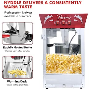 Mesa Aquecida: Esta pipoqueira de bancada inclui uma mesa aquecida e lâmpada de aquecimento para manter a pipoca fresca e quente. Uma bandeja de grãos embutida coleta os grãos não estourados, garantindo resultados perfeitos em cada lote, seja para uso doméstico ou comercial.