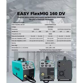 Especificações técnicas: - modelo bivolt 220v/127v; - dimensões: c 43 x l 20 x a 33 - processo de solda: mig/mag, mma, tig; - solda chapas de até 5mm; - faixa de amperagem: 20 - 160a; - ciclo de trabalho: mig/mag - em 127v - 13020 / em 220v - 16020; tig 13020 e 5910 / eletrodo 12020 e 54100 / 13020 e 59100; - tensão vazio: 127v - 83 / 220v - 72; - ajuste de indutância: sim; - ponteamento mig; sim; - refrigeração forçada; - peso equipamento 11kg; - entrada conectores 9mm;